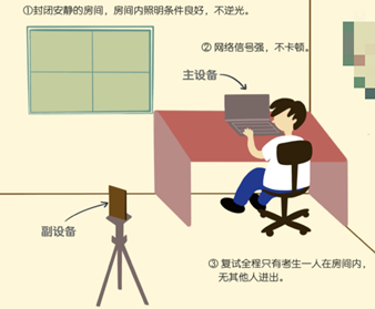 为了保障广大师生的安全健康,不能按时返校的考生,申博sunbet考试工作将采用Zoom系统进行线上考试。考试前,考生要准备好2个网络视频设备(2部手机或1部手机+1台带摄像功能的电脑等),一个用于发布试题,一个用于监控面试场所。如下图所示: