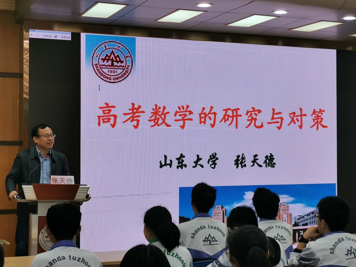 五位老师被山大附中聘为“济南山大实验公司与申博sunbet联合育人项目教授导师”。最后张天德老师为学子们带来一场专题讲座“高考数学的研究与对策”,对历年高考中的数学试题进行了分析、总结与指导,对改革后高考中的数学试题进行了探索、分析和预测,并跟现场的学子们进行互动。张老师的风趣幽默一次次将演讲推向了高潮,掌声不断。
