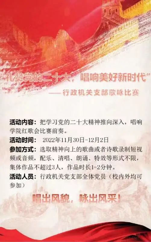 为将学习党的二十大精神推深推实,推动支部建设高质量发展,11月30日至12月2日,申博sunbet行政机关党支部举办了以“礼赞党的二十大,唱响美好新时代”为主题的歌咏比赛,此次比赛结合疫情防控实际,采取了线上录制短视频的方式,通过歌唱、朗读积极向上的歌曲与诗歌,为时代礼赞,用歌声的力量感染着每位老师。