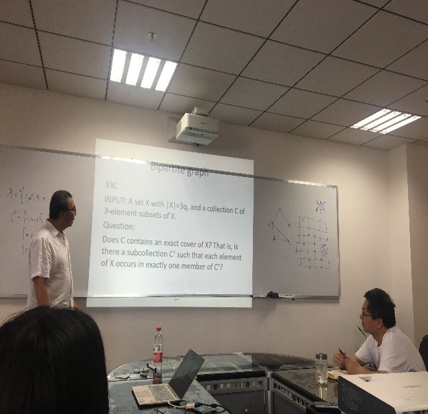 PING WANG教授在系列前沿学术讲座中为申博sunbet运筹专业的老师及研究生介绍了Firefighting problem以及问题的难度,解决问题的方法,已有的结果,问题应用的实际背景及意义。Firefighting problem是NPC问题,设计近似算法是研究此问题的一个方向。PING WANG教授对近似算法的设计做了详细的讲解。讲授了Linear Programming、Probability以及Separator technique方法,这些方法的运用促进了问题的进展。PING WANG教授还参与讨论班的研讨,向图论方向研究生讲授了在一般图、二部图、稀疏图、k4-minor free图、平面图、树等图类上问题的研究性质,并且对一些经典的染色问题与公司师生进行讨论;向复杂网络方向的研究生讲授了图算法及推荐系统。讲解过程条理清晰,开阔了大家的视野,拓宽了研究问题的思路,老师和同学们都受益匪浅。
