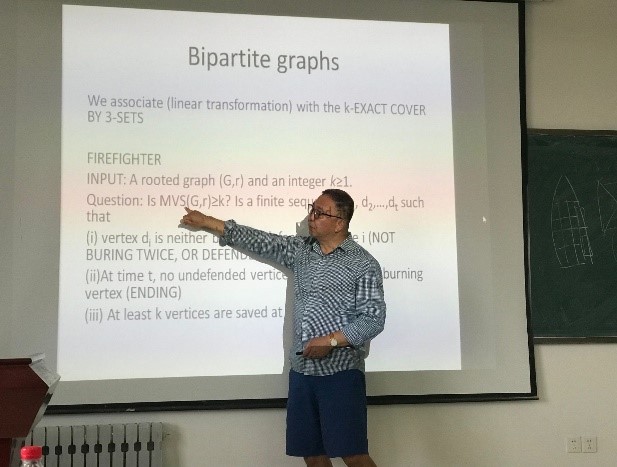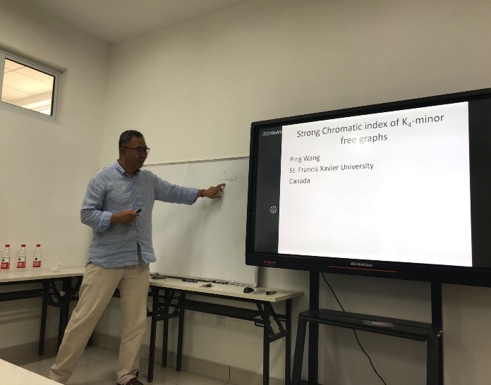 访问期间,PING WANG教授分别进行了题为“Fire Control (networks virus control) (2学时)”、“Firefighting problem and its related computation problems (2学时)”、“Fire on planar graph (2学时)”、“Using Bipartite networks to construct personal recommendation system (2学时)”、“Strong chromatic index of K4-minor free graphs (2学时)”、“Some open problems (2学时)”、“Firefighting problem in graph theory (3学时)”、“Community discovery in social networks (3学时)”的前沿学术讲座。
