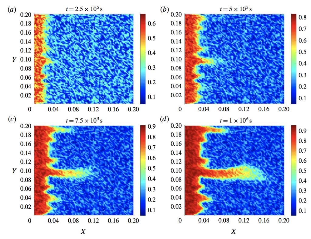 酸蚀蚓孔模型广泛应用于石油、天然气、二氧化碳等地下流体资源开发。蚓孔的形成须经一系列复杂的物理化学反应,其中储层孔隙度、酸的浓度、储层压力等都会对碳酸盐岩储层酸化过程有直接的影响,刻画蚓孔变化形态的非线性数学模型非常复杂,不可能得到解析解。因此数值求解变得尤为重要。为此,芮洪兴教授团队针对Darcy-Brinkman -Forchheimer框架下的酸蚀蚓孔模型,考虑从混合元、间断元、有限体积等不同的方法出发构造全解耦守恒型交错网格有限差分算法,研究得到其在非一致网格上的超收敛性。进行数值实验模拟孔隙度和酸的浓度的演变过程,展示碳酸盐岩储层的酸化过程,数值结果对油气采集具有指导作用。