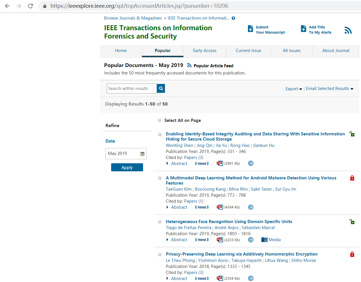 秦静教授为该论文通讯作者, 2017级博士生沈文婷为第一作者。TIFS是信息安全领域国际顶级期刊,也是中国计算机学会(CCF)推荐的A类期刊,2019年影响因子(IF)为6.211。该成果自2018年8月在这个期刊在线发表至今,一直处于热点论文排名第一。目前总被下载次数为7070。