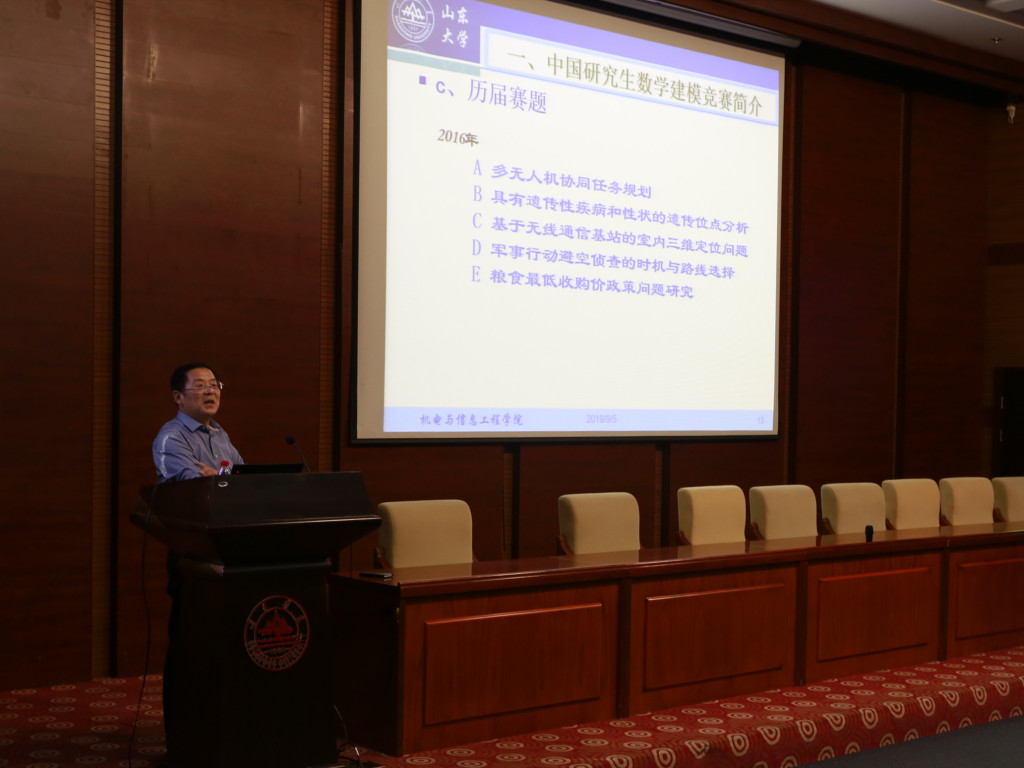 2019年9月5日下午,由数学学公司承办的珠峰讲坛在中心校区知新楼思源报告厅举行。中国研究生数学建模组委会委员张承进教授做客此次讲坛,为济南校区全体研究生建模参赛队队员做题为“研究生数学建模竞赛及其赛例解析”的学术报告。讲坛由公司党委副书记路云生主持。