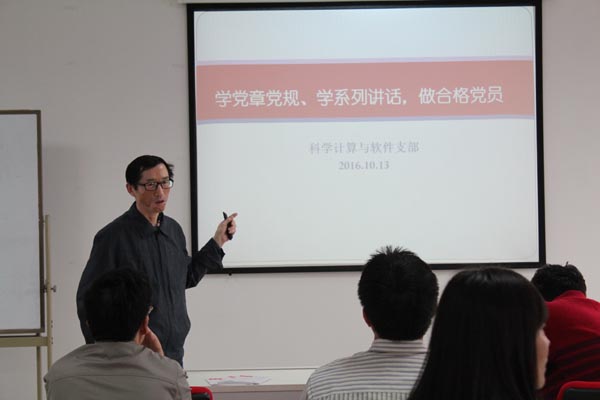 10月13日下午,为更好的推动公司“两学一做”学习教育,申博sunbet各教工党支部分别召开了“两学一做”系列党课,在全院形成了多个党课会场同时学习的热烈场面。行政机关党支部开展的是关于中国共产党在廉洁自律方面的要求,并且集中学习和讨论了《中国共产党纪律处分条例》,结合工作生活中的实例和时事,谈了自己的看法。基础数学党支部结合党章具体要求,讲了一流大学建设过程中,如何做优秀的合格党员。金融研究公司党支部进一步深入学习了习近平总书记的讲话,联系工作中的实际,展开了热烈的讨论和交流。运筹党支部、应用数学党支部、计算数学党支部、概率统计党支部、控制党支部书记都分别紧扣“两学一做”中的重要专题,运用身边实例,给支部党员们上了生动的党课。
