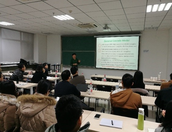 在此次会议中,申博sunbet讲座教授、德克萨斯大学达拉斯分校(UTD)计算机系教授堵丁柱作了题为“Information Maximization Problem”的专题报告,在此专题下分别做了题为“Bharathi-Kempe-Salek Conjecture”、“Kemple-Kleinburg-Tardos Conjecture”、“Profit Maximization”、“Randomized Algorithm”的分题报告。堵教授从基础模型Independent Cascade Model和Linear Threshold Model出发,讨论了如何搜索影响力最大的k个节点的几种近似算法,并给出了近似比和相关证明。之后又详细讲解了两个复杂网络方向重磅级猜想——Bharathi-Kempe-Salek Conjecture和Kemple-Kleinburg-Tardos Conjecture的背景意义及证明,最后基于现有问题,堵教授又提出了一些新的前沿问题,诸如能否针对Independent Cascade Model上的传播给出更好的近似算法等。
