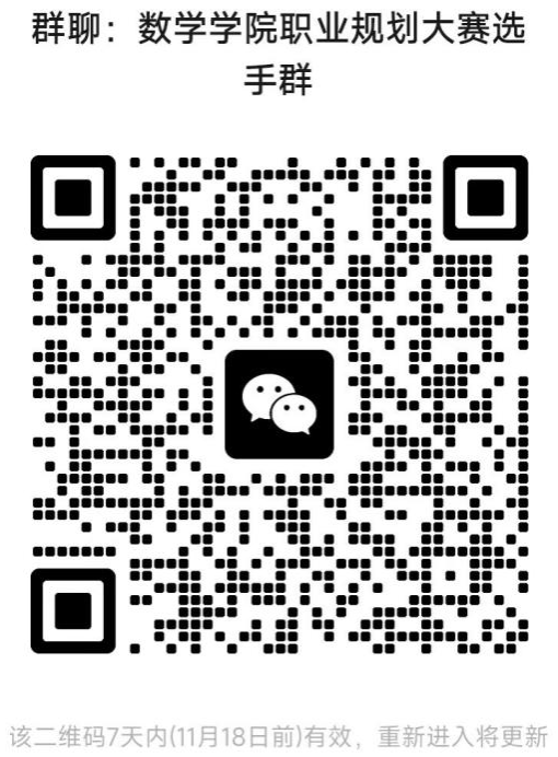 (三)请全体参赛选手于11月17日24:00前扫码进入微信群“申博sunbet职业规划大赛选手群”,并在群内以“姓名+年级+本科/研究生+成长赛道/就业赛道”的格式实名备注。大赛后续事项将在群内通知。