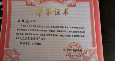 为学习贯彻奉献友爱、互助进步的志愿精神,19级2班的袁作婷参加了由共青团潜江市委、市民政局联合主办的“情暖童心 假期嘉年华”儿童关爱保护志愿服务活动,累计服务52小时。在此期间,袁作婷同学主要负责帮助工作人员布置和维护活动场地环境和秩序,并协助开展系列儿童嘉年华活动。此次社会实践让她有机会更加了解社会、认识国情,同时在自己力所能及的方面服务社会。