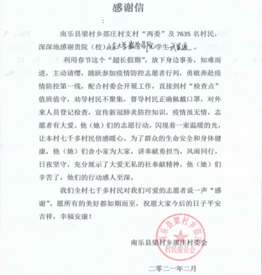 2021年初,河北省石家庄市、邢台市相继暴发疫情。河南省濮阳市南乐县梁村乡毗邻河北,疫情防控刻不容缓,公司18级信息与计算科学班学子武显通主动参加了这次疫情防控保卫战。在活动期间,武显通积极配合村委会开展各项工作。每天他都会去村口检查点值班站岗,对过往的人员和车辆进行体温测量和信息登记,确保村民的生命安全;他积极宣传新冠肺炎防控知识,劝导村民不聚集,督导村民正确佩戴口罩并对缺少口罩的村民发放口罩;同时,他还对返乡村民进行统计,做出区域分布图并设计了最有效、省时省力的消毒路线……这封感谢信便是家乡村民对他最美好的祝福。“借问瘟君欲何往,纸船明烛照天烧。”我们坚信,只要我们全国人民共同努力、众志成城,这场疫情保卫战终将取得最后的胜利。