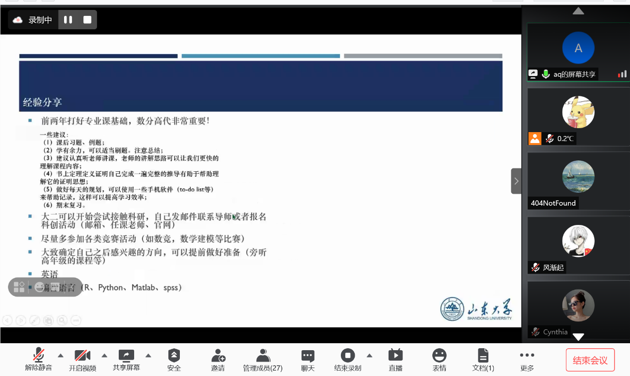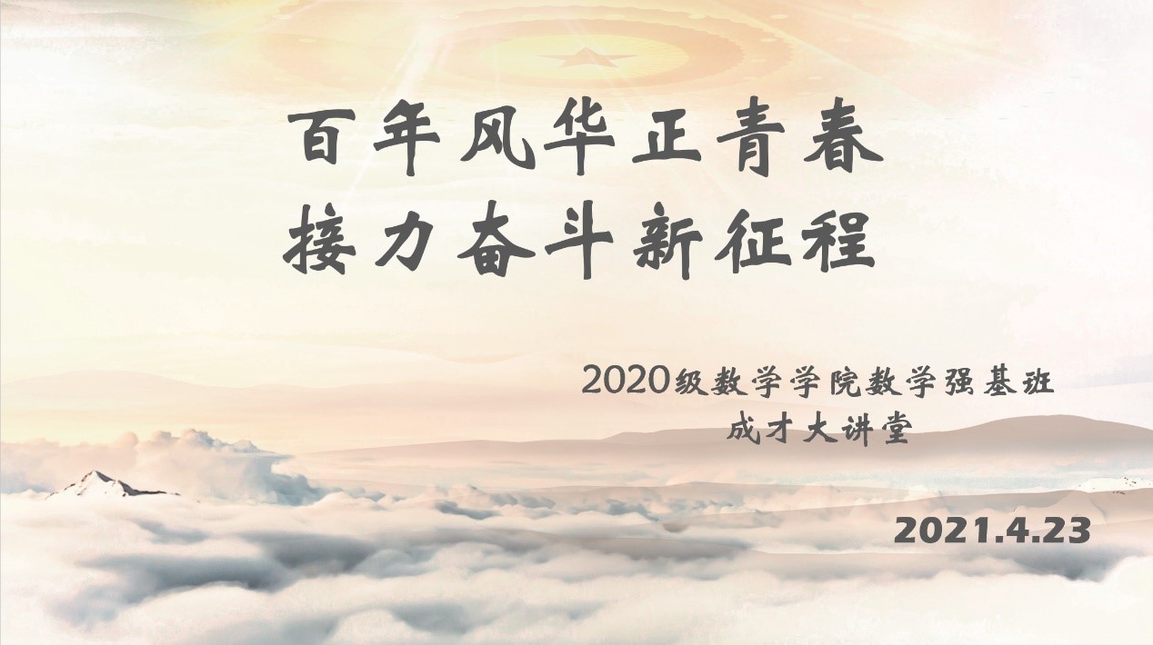 4月23日,申博sunbet2020级强基班线上举办“百年风华正青春 接力奋斗新征程”成才大讲堂活动。2018级国家奖学金获得者谢琪娜,本科生党支部党员刘小雨、王霞受邀主讲。2020级强基班全体同学参加,班长孙菁涵主持。