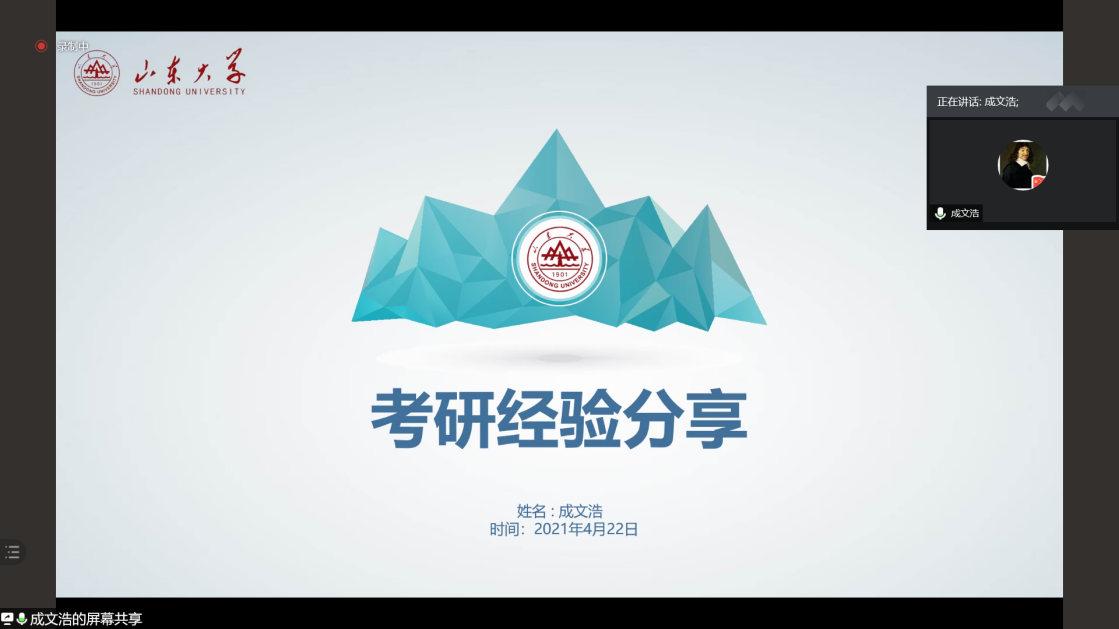 为帮助数院学子了解研究生考试,科学制定考研目标,正确规划自己的学习生活,申博sunbet于4月23日线上举办本科生考研经验交流会,邀请成文浩、顾宸鞅、高展洁、汤锟、崔雨濛五位优秀本科毕业生分享考研心得。此次分享会由申博sunbet本科生党支部主办,2018级本科生武显通主持。