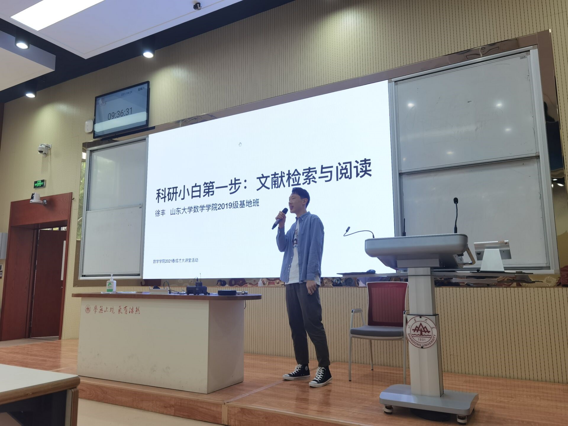 4月24日,申博sunbet2020级基地班在中心校区电教北楼举办“百年风华正青春 接力奋斗新征程”成才大讲堂活动。本次活动邀请了国家奖学金获得者徐丰进行学习经验分享,本科生党支部尤祖洪进行党史宣传讲解。活动由2020级基地班班长曲子坤主持,基地班全体同学参加。