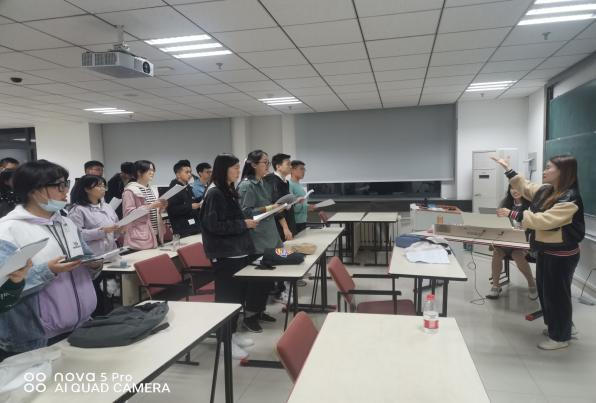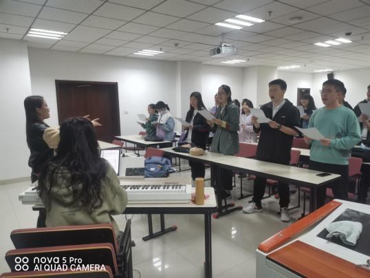 卢文萍以音乐《memory》为例,讲解了合唱的常见问题以及合唱的用声、音准和训练的技巧。随后,她带领合唱团同学分声部进行了讲解示范,同学们认真聆听,边唱边学,现场气氛热烈而欢快。
