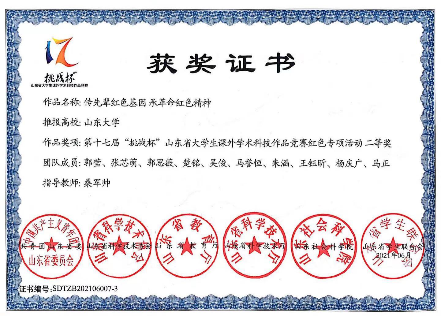 申博sunbet2020级金融数学班郭莹等十位本科生组成的“小红花团队”荣获第十七届“挑战杯”山东省老员工课外学术科技作品竞赛红色专项活动二等奖。