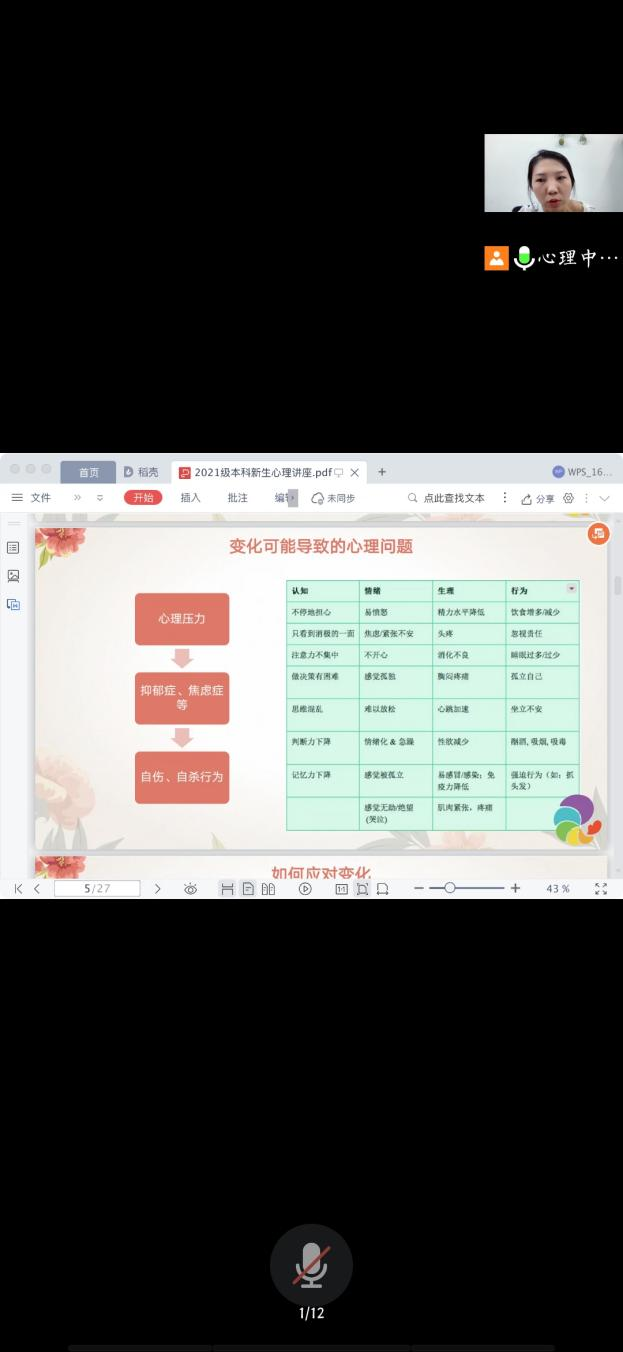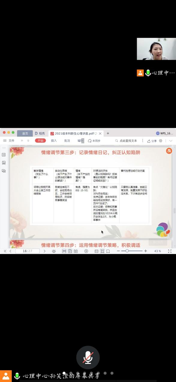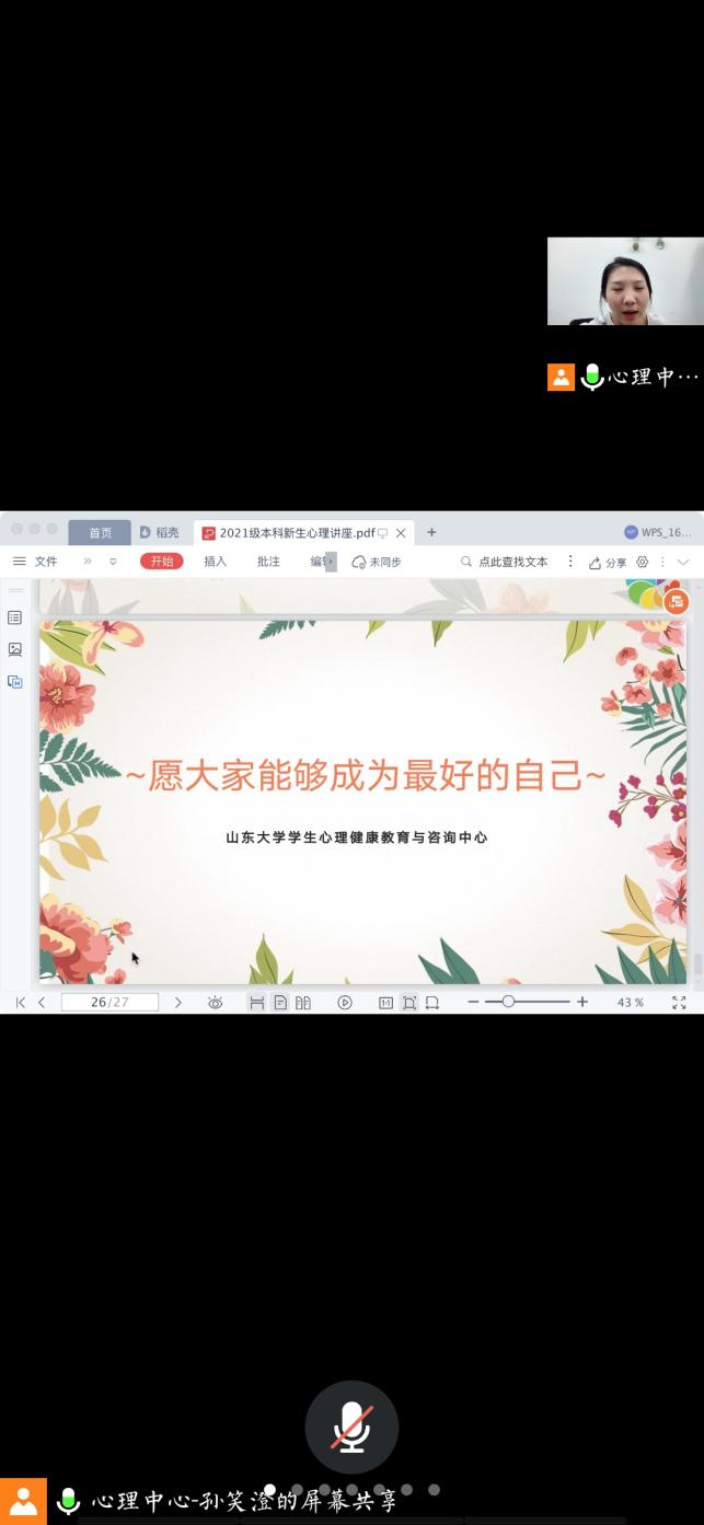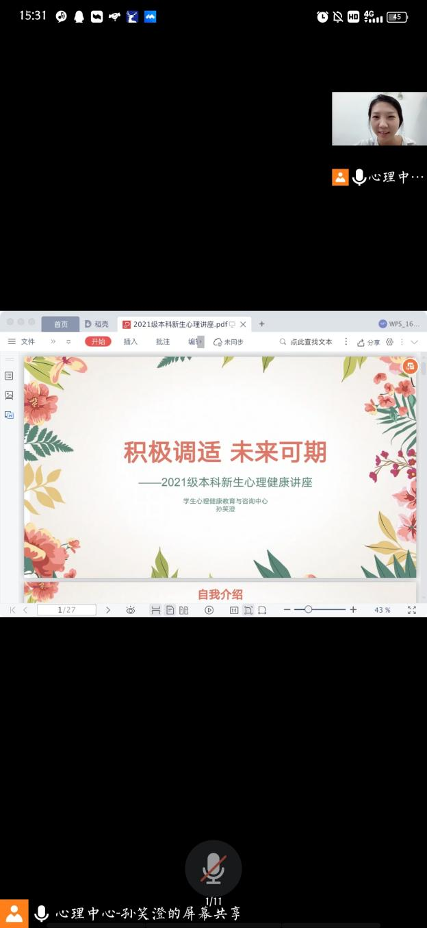 2021年9月26日下午3时,申博sunbet在线上召开了2021级本科新生心理健康讲座,辅导员宋金灿老师与2021级申博sunbet全体同学参会。员工心理健康教育与咨询中心的孙笑澄老师以“积极调试,未来可期”为主题,向同学们介绍了初入大学可能会出现的心理问题,并讲述了相关解决问题的方法。