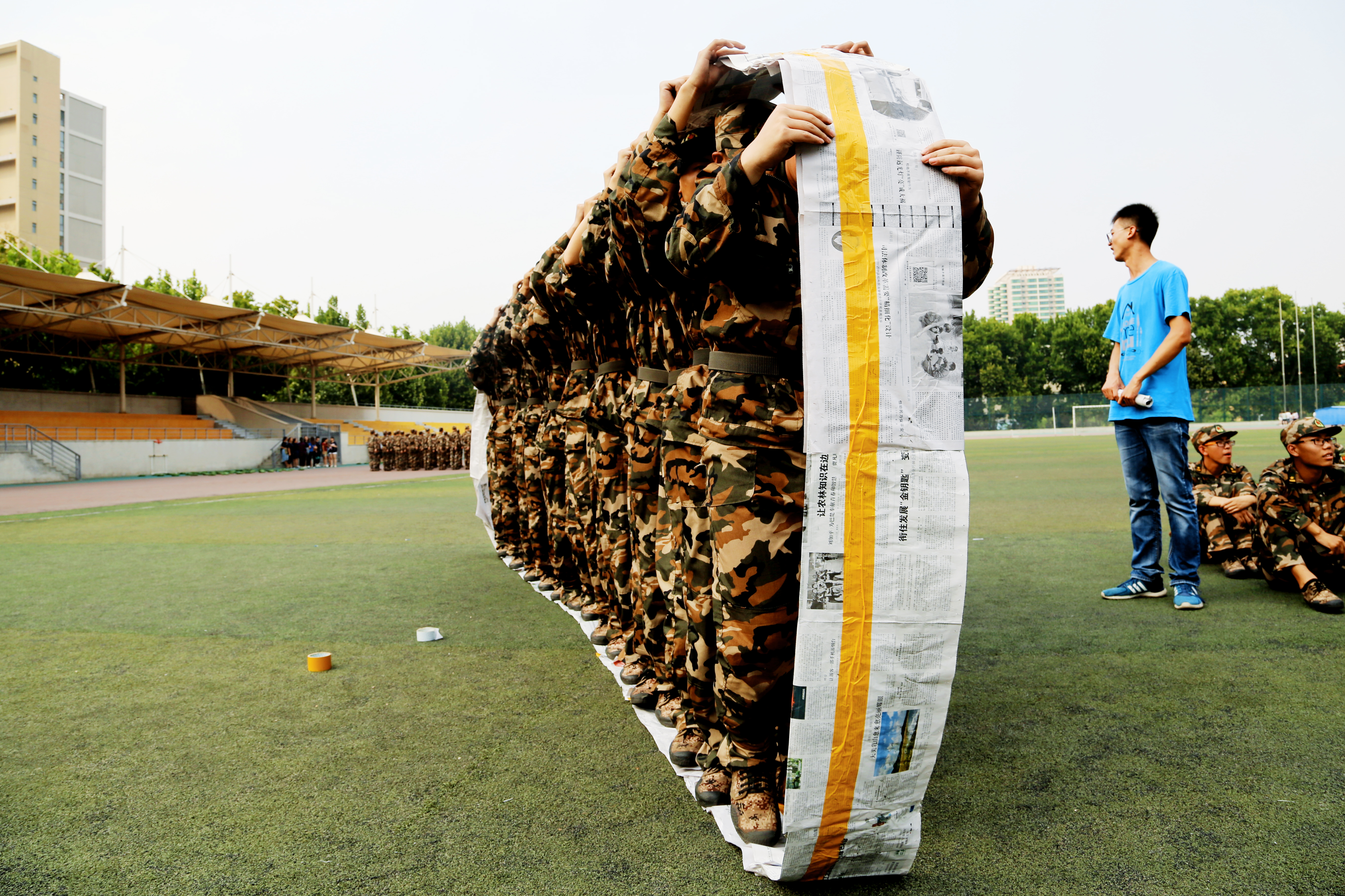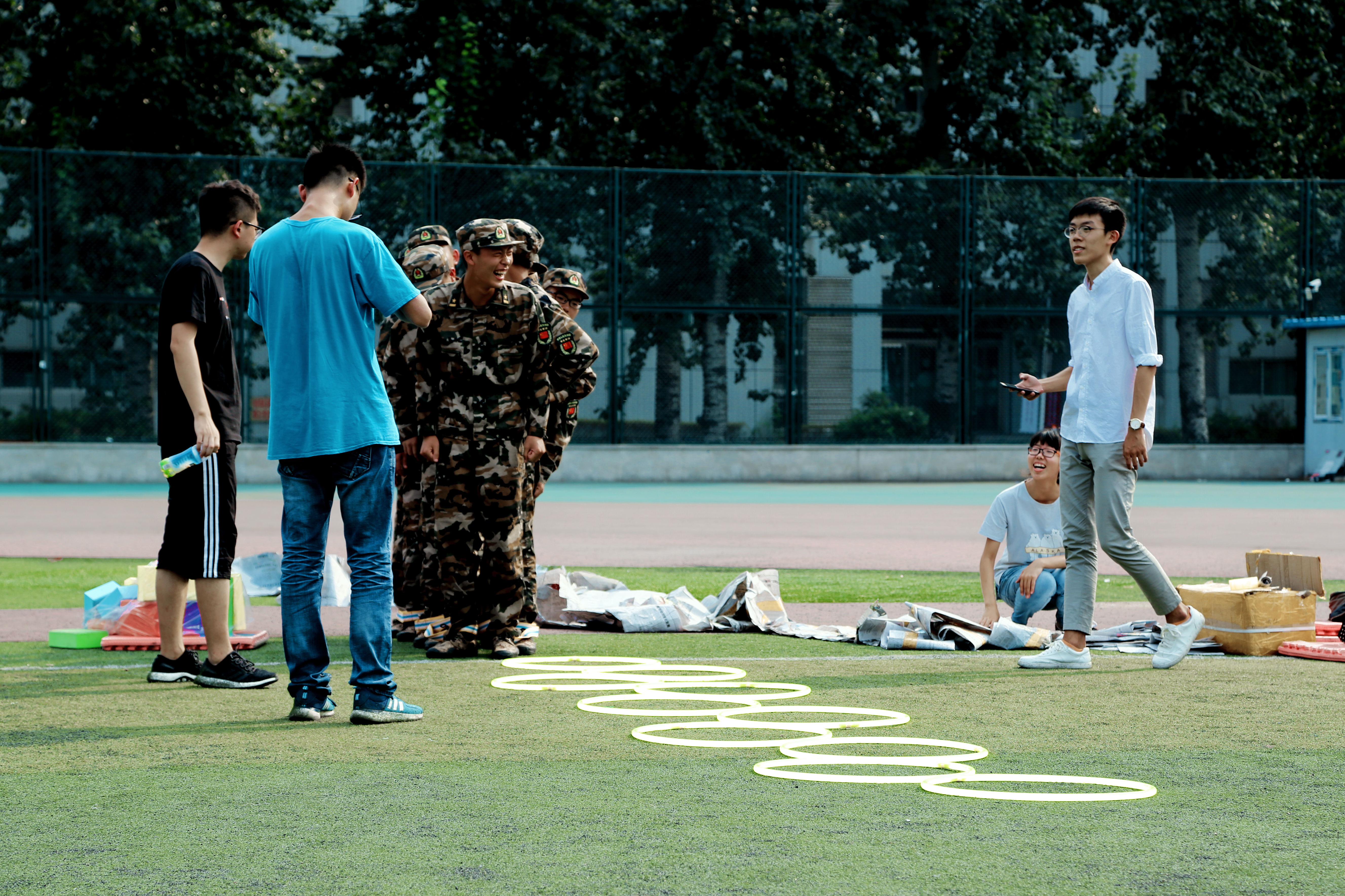 在心理健康讲座之后,2017级全体同学前往操场参加本次新生入学系列教育的第二项内容——素质拓展。同学们纷纷忘记了上午训练的疲惫,积极地参与到活动中。