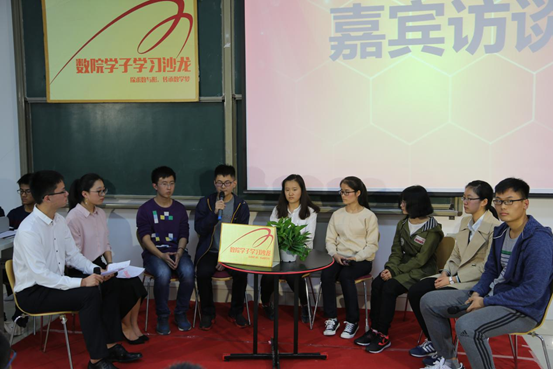 在嘉宾访谈环节,七位优秀的数院学子到台上就坐,接受主持人和现场同学的提问。问题涉及各方各面,如具体的学习方法建议,如何做好学习与员工工作的平衡,社团推荐。有些同学规划长远,问到了大三分专业,社会实践情况乃至出国的要求等,台上的学长学姐均予以耐心解答。本次沙龙活动期间还插入了抽奖活动,为大一新生带来福利的同时极大地活跃了现场气氛,拉近了嘉宾与同学们的距离。