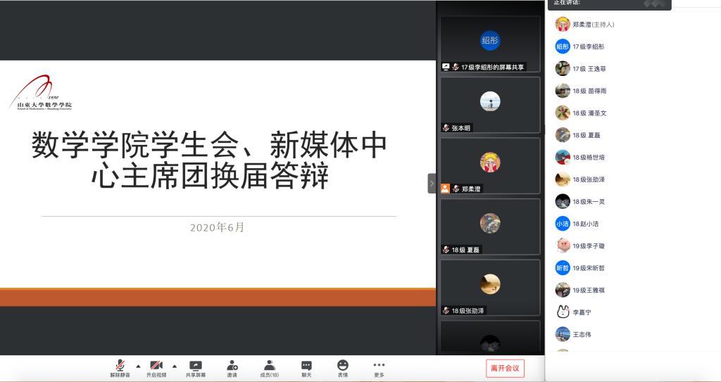 2020年6月13日下午2:30,申博sunbet员工会、新媒体中心举办主席团换届线上答辩会。公司党委副书记路云生,班主任老师王志伟,团委老师郑柔澄、张本明及现任主席团同学们担任评委,10名同学参加答辩,部分同学观摩学习。
