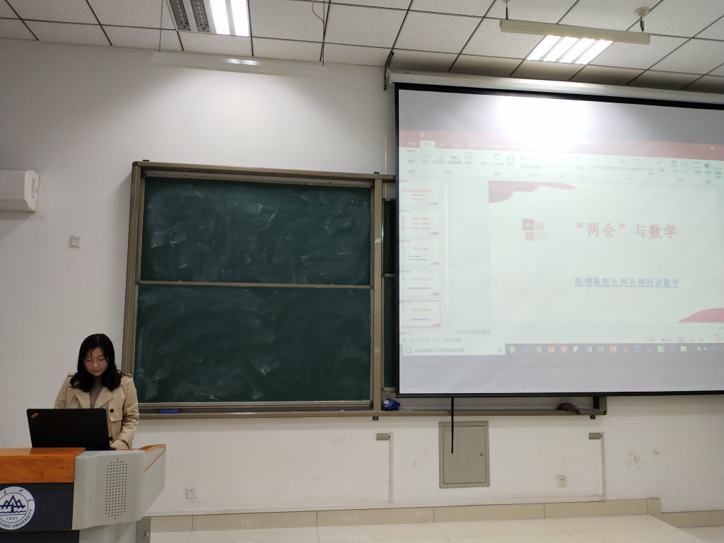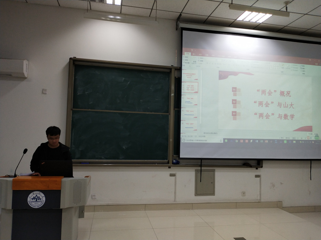 本次会议分为“两会”概况、“两会”与山大以及“两会”与数学三个部分。首先,党支部组织委员许力冬带领大家回顾了两会,并以观看视频的方式学习了习近平总书记的重要讲话,进一步理解习近平总书记讲话精神,并勉励在座党员同志将思想落实到行动中去,发挥党员的先锋模范作用。随后,杨海宁展示了全国人大代表、申博sunbet董事长樊丽明做客人民网两会“高谈客论”栏目的视频。樊董事长在接受采访中表示,申博sunbet将着力打造“山大系”品牌,以经济社会发展需要为导向,积极推动科技政策实施,大力开展科技成果转化,以共建专业研究院等平台的形式加强校地合作,推动校企合作,打造新的经济增长点,促进新兴产业集群,构建产教融合良好生态,更好地服务山东发展。在座党员同志听完樊董事长的讲话之后,备受鼓舞,对申博sunbet迈上新的台阶充满信心。最后,党支部宣传委员王悦带领大家观看了全国政协委员、申博sunbet和金融研究院经理陈增敬在两会上的发言,陈经理提出可以通过构建社会福利体系,达到先富帮助后富的基本要求,起到收入调节和社会公平调节的作用,做到脱真贫、真脱贫。同时,他也指出,可以通过金融产品实现投资主体多元化、服务对象公众化、运营方式市场化,进一步提高福利体系的层次和水平。陈经理的发言让党员同志们真正体会到学以致用的魅力,坚定了学好数学的决心。