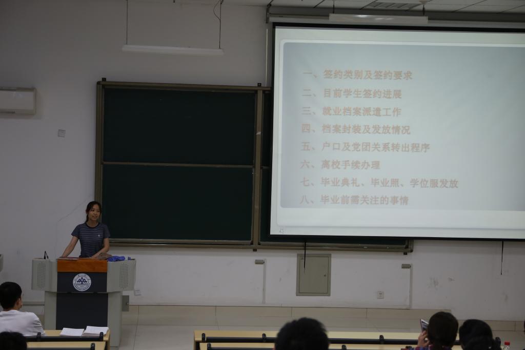 此次会议主要围绕研究生毕业生近期需要完成的一系列工作展开。首先,鲁皓为同学们分门别类地系统介绍了大家所签工作的签约类别以及相应的签约要求,在宏观上把与会同学的关注点分散开来,使同学们对号入座,有所侧重。在展示当前员工的签约进展阶段,鲁皓分别介绍了就业档案的派遣工作流程以及同学们需要注意的事项。然后,为大家解释了同学们的档案组成,封装及其发放情况;对于毕业后户口和党团关系的转出程序,鲁皓解释了相关同学提出的问题,使大家能顺利高效地完成自己的工作。为了让大家给自己的山大生活留下一个美好的结尾,鲁皓为大家讲解了毕业前需要关注的事情,比如:毕业典礼,毕业照和学位服的发放问题,在满足相关规定的前提下尽可能地满足同学们的需求。