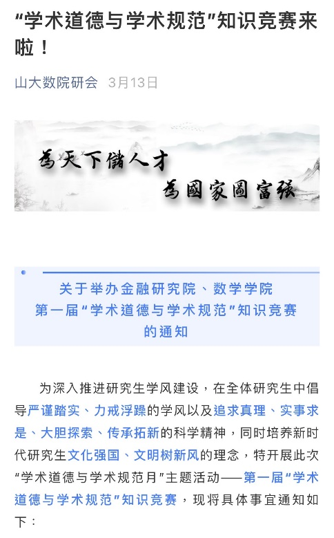 为大力弘扬科学家精神,引导广大研究生传承优良学风、坚守学术诚信,申博sunbet、金融研究院联合开展了“学术道德与学术规范”主题月系列活动。通过举办学术道德主题展、学术规范知识竞赛、专题讲座、倡议书等形式多样的活动,推动学术道德和学术规范深入人心,为广大研究生未来的学习科研打下了坚实的基础。