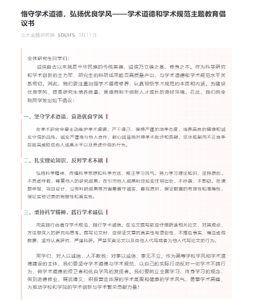 3月11日,公司于线上公众平台发布了学术道德规范倡议书,从坚守学术道德、反对学术不端、营造优良学风三方面深刻阐明了恪守学术道德、弘扬优良学风的重要意义和现实价值,全体研究生在倡议书上签名,在一言一行中扩散恪守学术道德和学术规范的正能量。