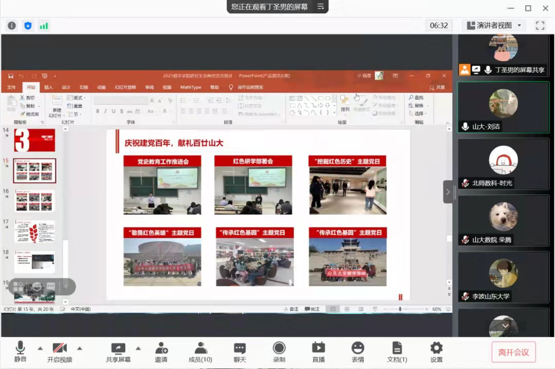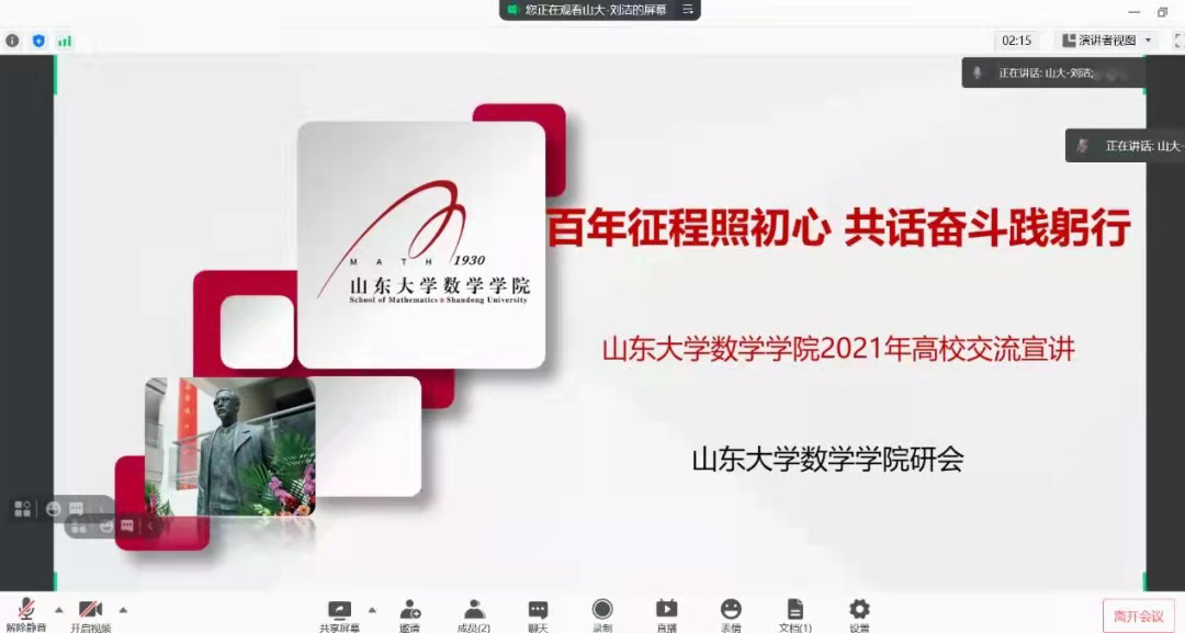 2021年7月8号星期四,申博sunbet同北京大学申博sunbet、复旦大学数学科学公司、北京师范大学申博sunbet线上开展了“百年征程照初心、共话奋斗践躬行”高校研究生会宣讲交流活动。