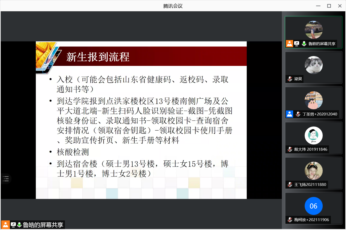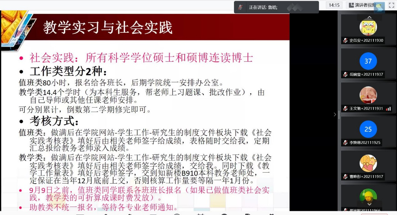 为确保2021级新生顺利入学,申博sunbet统筹疫情防控和迎新工作,于9月4日,组织召开2021级新生入学线上班会。辅导员鲁皓老师、院研究生会主席团成员以及2021级全体新生出席了本次会议。会议就新学期开学有关事宜作出安排部署。