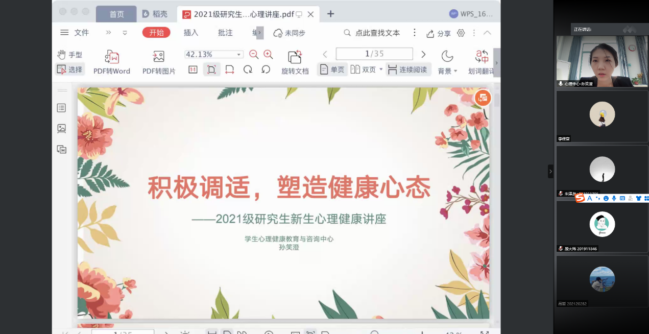 2021年9月10日上午9时,申博sunbet在线上开展了2021级研究生新生心理健康讲座。员工心理健康教育与咨询中心孙笑澄老师就“积极调试,塑造健康心态”主题为新生们针对研究生阶段可能遇到的心理问题提出了应对方法。
