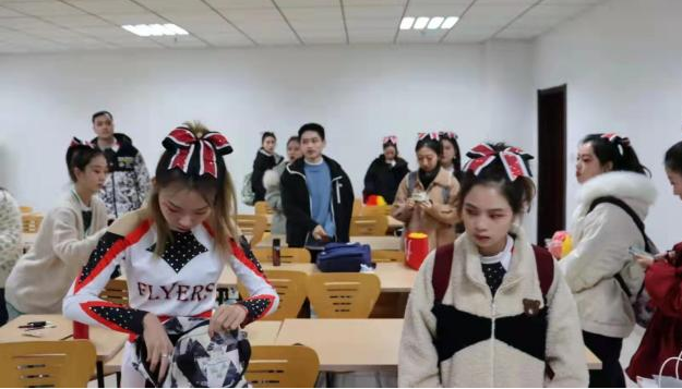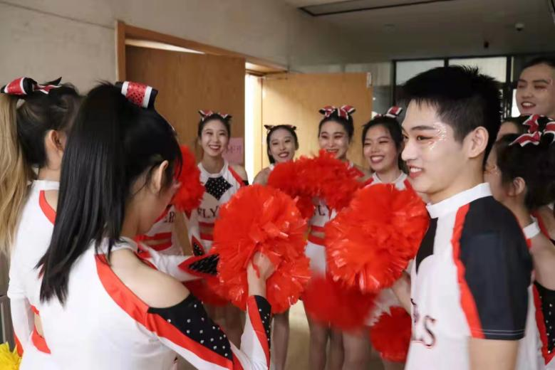 21日清晨,数学金融联队早早来到后台,在学姐们的协助下画好妆容换好队服整理好发型,满怀期待地进入候场室展开准备工作。而此时的观众席上,公司同学也早早就位,时刻准备为啦啦队成员们应援打call。