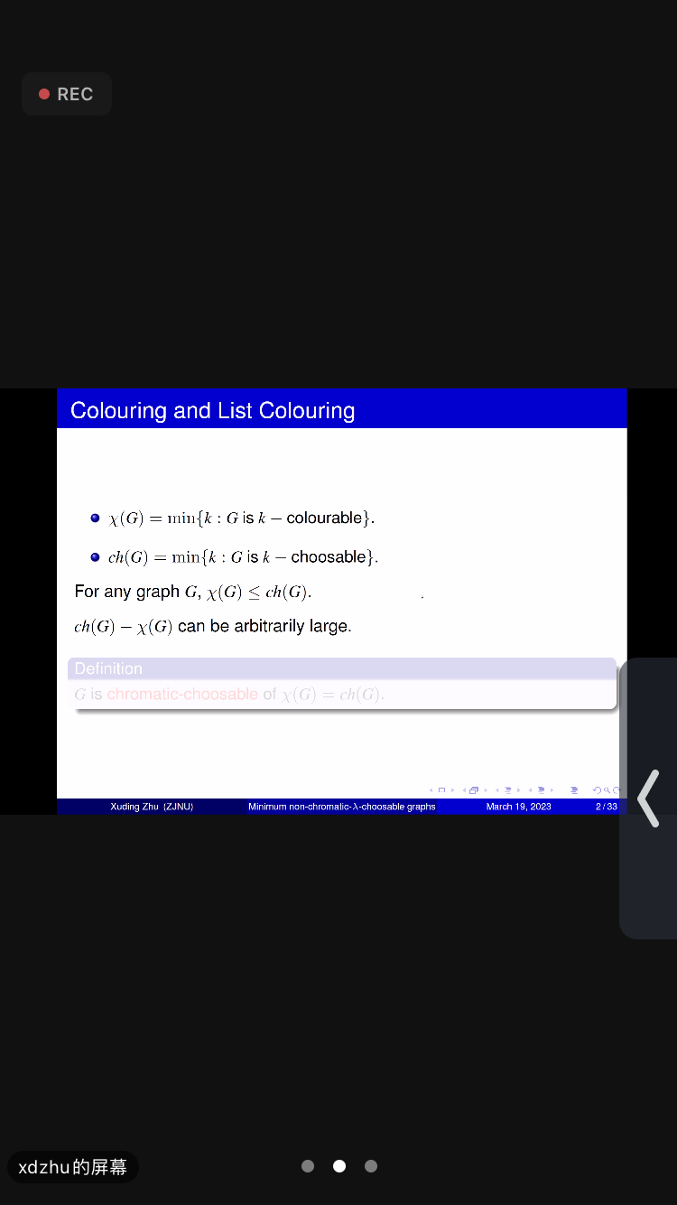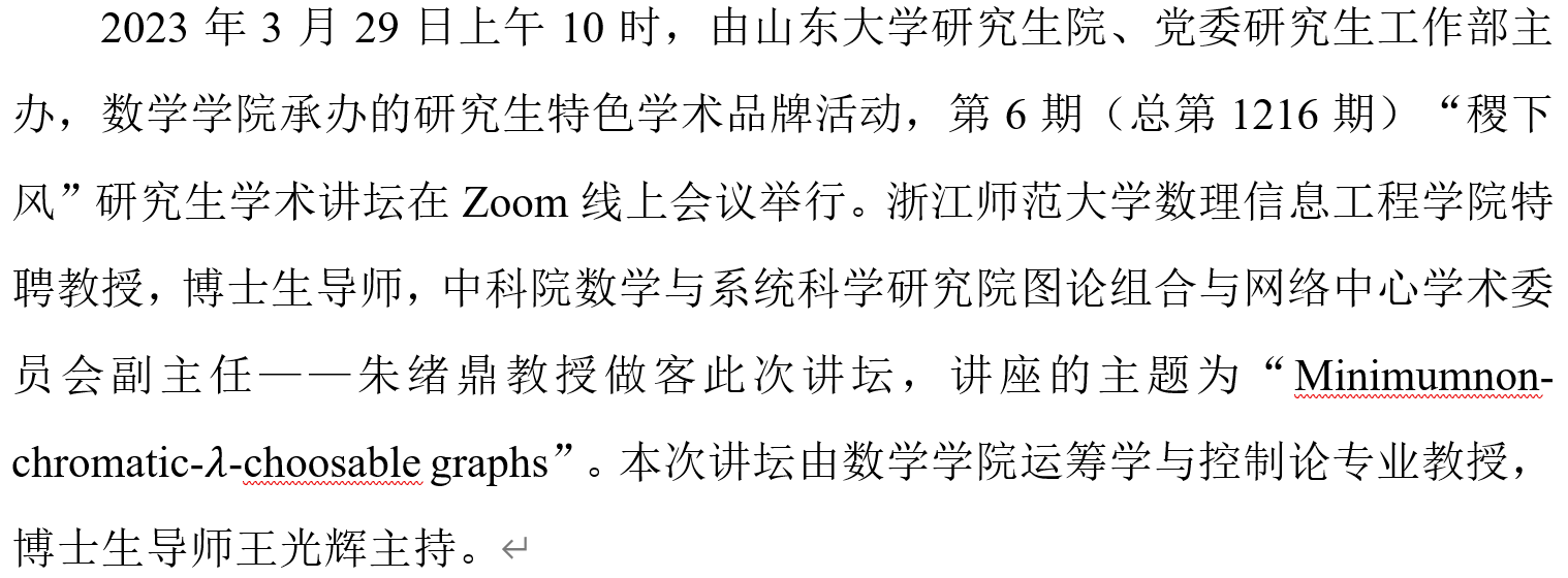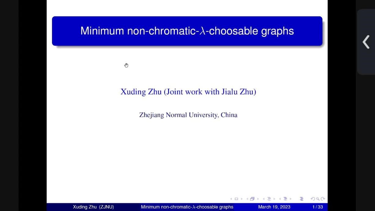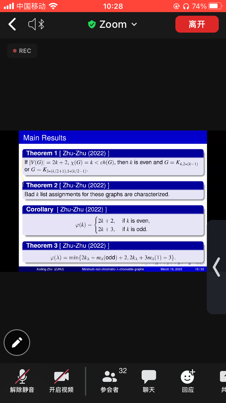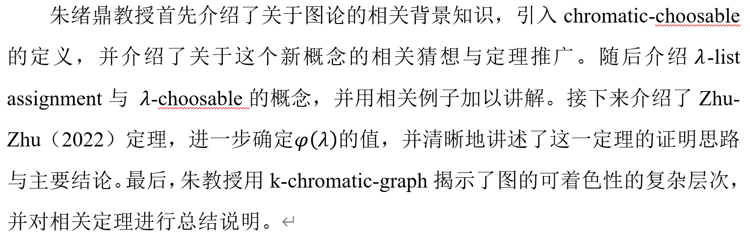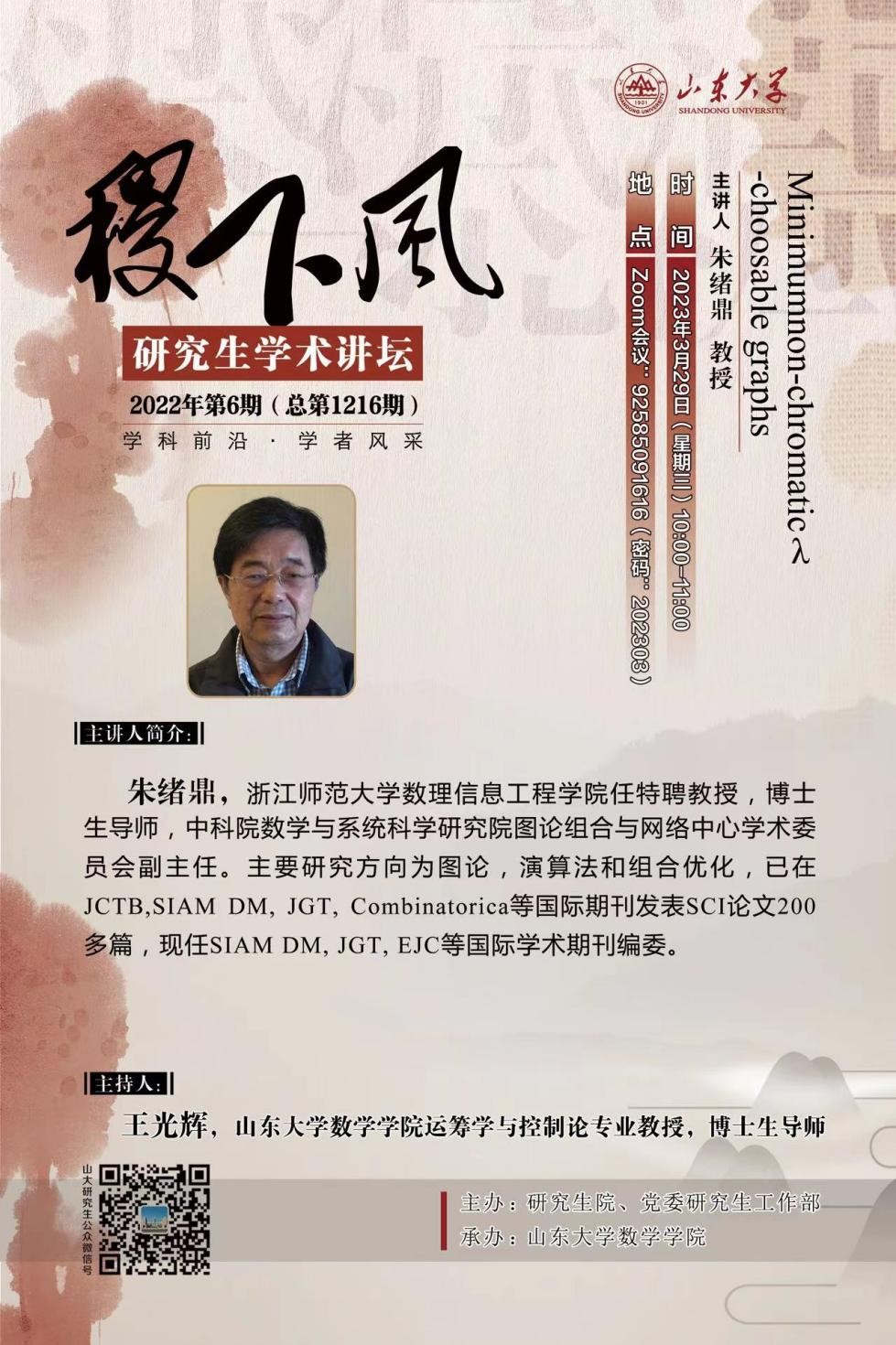 主讲人简介:朱绪鼎,浙江师范大学数理信息工程公司任特聘教授,博士生导师,中科院数学与系统科学研究院图论组合与网络中心学术委员会副主任。主要研究方向为图论,演算法和组合优化,已在JCTB, SIAM DM, JGT, Combinatorica等国际期刊发表SCI论文200多篇,现任SIAM DM, JGT, EJC等国际学术期刊编委。
