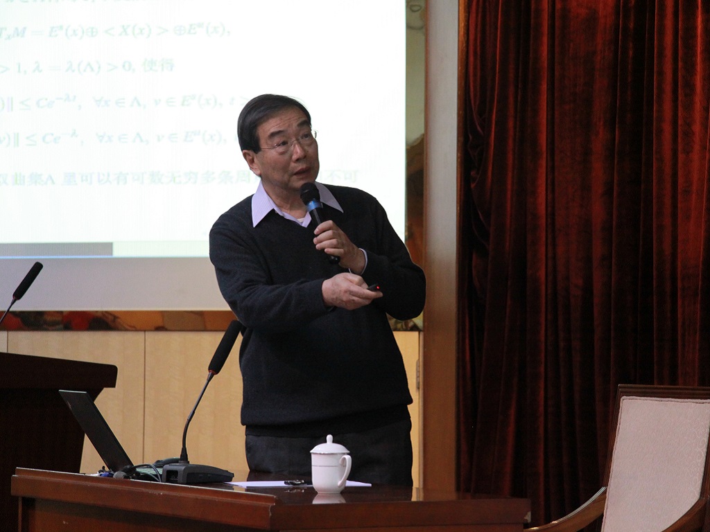 本次报告主要内容为星号流的刻画问题,文兰院士结合相关定义、定理深入浅出的介绍了星号流刻画问题的发展解决过程。首先,文兰院士对于与星号流有关的概念如双曲奇点、双曲周期轨道以及双曲紧集等作了简单阐述,对于微分同胚定义以及Smale1967年提出的公理A也进行了说明,便于同学们更好的认识星号流问题。随后,文兰院士着重介绍了星号流概念以及其发展的历程。文院士提到,星号流是廖山涛教授研究稳定性猜测过程中提出的概念,星号流在刻画问题上共有三次重大的概念突破。起初,根据廖山涛教授提出了隔离型概念,廖山涛和Gan-Wen逐步证实了隔离型星号流可用双曲集进行刻画,解决了部分星号流刻画问题;随后,为解决由Lorenz吸引子引出的非隔离星号流刻画问题,Moralies-Pacifico-Pujals提出了奇异双曲集的概念,并证明了非隔离星号可以用奇异双曲集来刻画,实现概念上的突破;之后,Bonatti-daLuz又发现5维空间构造的非隔离星号流并不能用奇异双曲集刻画,并提出了多重奇异双曲集的概念,用来刻画通有非隔离星号流。至此历经30多年的星号流刻画问题终于落下帷幕。报告过程中,文兰院士还提到微分同胚形式与向量场完全不同,对微分同胚,星号流问题则较简单,可直接用一致双曲来刻画。