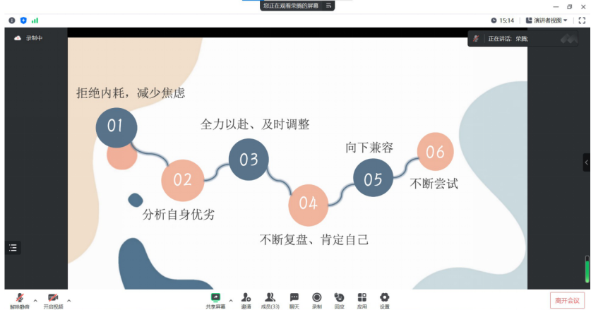 本期“青年话成长”主题沙龙活动围绕员工成长主题,旨在帮助同学们更好地安排研究生生活,合理规划个人成长发展之路。青衿之志,履践志远,本次活动不仅为研究生提供了交流互动的平台,也拓宽了同学们的职业视野和思路,对未来的求职计划有了更加清晰的认知。