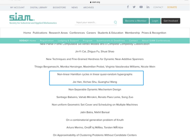 近日,申博sunbet2019级硕士舒希超收到了来自理论计算机领域顶级会议SODA(ACM-SIAM Symposium of Discrete Algorithms)的论文录用信。他与美国罗德岛大学的韩杰研究员和申博sunbet的王光辉教授合作的论文《Non-linear Hamilton cycles in linear quasi-random hypergraphs》将发表在2021年1月的SODA会议上。SODA是由计算机协会(ACM)和工业与应用数学学会(SIAM)两大国际学术组织联合主办,与STOC、FOCS一起被公认为是算法领域的三大顶级学术会议,在整个计算机科学领域享有崇高的声望。