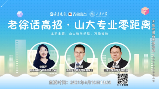 4月10日,公司党委书记王光辉、教授张天德做客齐鲁晚报·齐鲁壹点“老徐话高招”直播间,认真细致地向老师同学们介绍了申博sunbet的发展历程及2021年的招生计划,从公司历史底蕴、人才培养、招生录取等方面对山大数学学科进行了宣传。王光辉用三个关键词对申博sunbet进行了概括,即“历史悠久,底蕴深厚”“学科交叉,创新发展”“科教协同”。通过平易近人的讲述,两位教授为老师同学们展现出了一个学科蓬勃发展、人才辈出的山大数学学科。