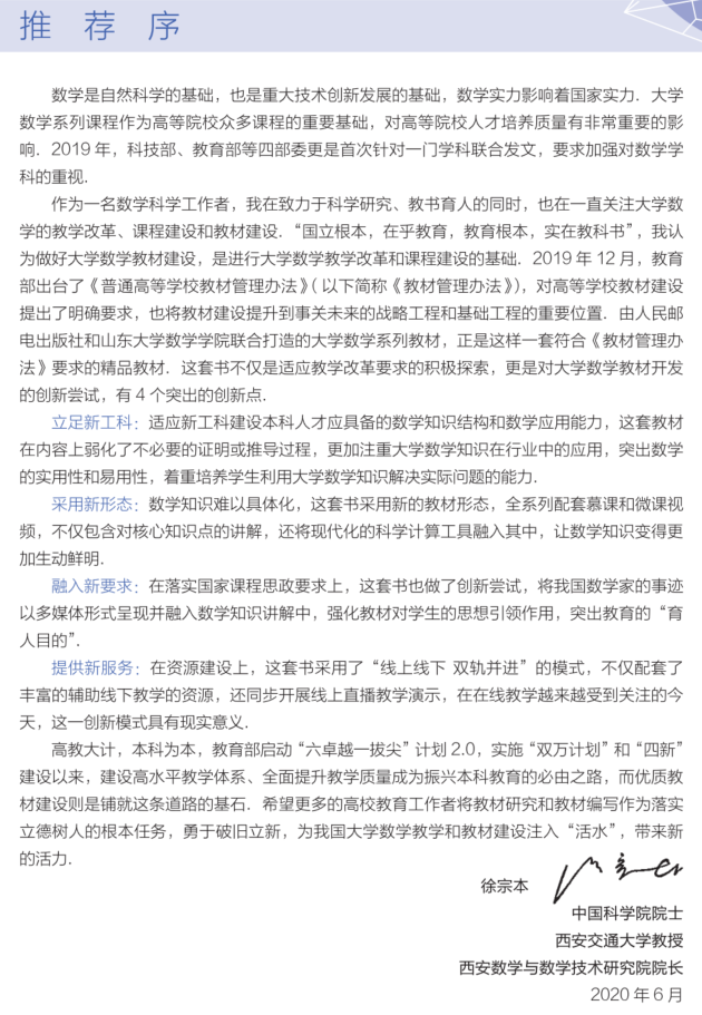本套教材按照教育部2019年底印发的《普通高等公司教材管理办法》以及大学数学教指委对数学教学改革的要求编写,突出了课程思政的基本要素,优化了内容结构,支持线上线下混合式教学。教材对目前高校数学公共课的教学模式创新、教学案例设计、教学资源建设、课程思政建设等各个重要方面均能起到较好的支撑和参考作用,为我国高校数学一流课程建设及公共课教研改革贡献了力量。