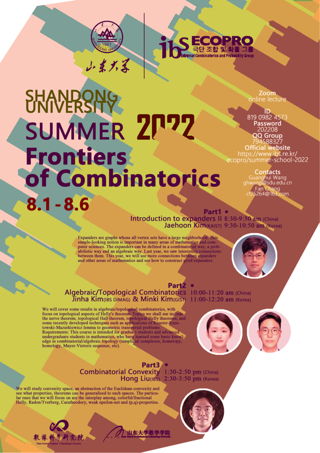 为拓宽员工的国际视野,促进学术交流,申博sunbet与韩国基础科学研究院极值与概率组合组于2022年8月1日至6日成功举办“2022国际暑期公司《组合前沿》”。本次暑期公司秉承“精品化、国际化、创新型、开放式”的理念,采用线上教学模式,吸引了来自中国科公司大学、北京大学、复旦大学、南开大学、中国科技大学等国内知名高校以及来自韩国、法国、英国、美国等国家的青年学者、员工共500余人参加。
