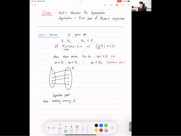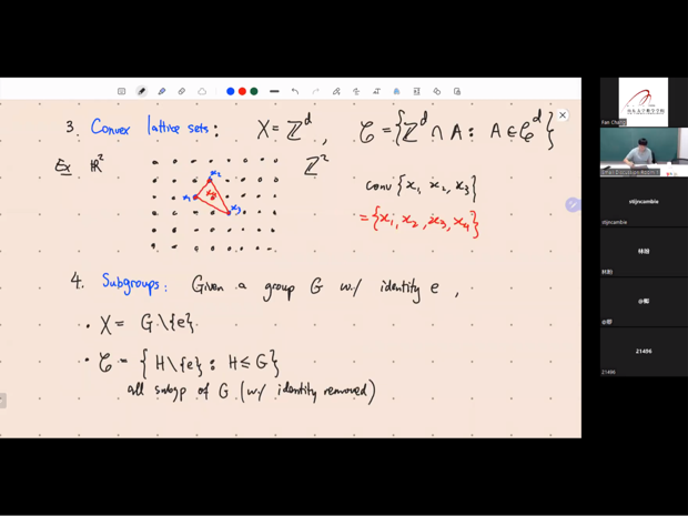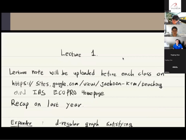 《Combinatorial Convexity》承接申博sunbet国际化课程《离散几何》,内容涉及经典的Radon/Carathéodory/Helly定理至抽象的凸性空间的推广和Colorful Helly/Fractional Helly定理等,环环相扣,层层推进,为我们呈现了凸性空间的种种优美性质。《Introduction to expanders》延续2021年暑期公司内容,介绍谱图理论与代数expander与其他数学分支的联系,包括图的拉普拉斯算子及应用、非正则图的随机游走、interlacing方法等。Jinha Kim和Minki Kim一起为我们带来了拓扑组合学的精彩内容,他们以Brouwer不动点定理/Sperner引理/KKM定理三个拓扑组合工具为基础,介绍了拓扑Helly定理、(p,q)定理、Colorful KKM定理等。