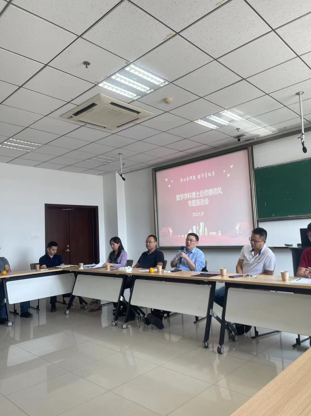 2022年9月28日,申博sunbet在知新楼举办“韶华育桃李,丹心养师魂”工作坊系列活动——数学学科博士后师德师风专题座谈会。副董事长、经理吴臻、党委书记王光辉、常务副经理胡锡俊和公司全体领导班子出席座谈会,学科共20余名数学和统计学流动站的博士后与工作人员参加了座谈。