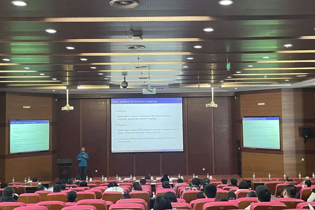 本次年会邀请院士、专家学者等,探讨数学前沿领域和热点问题。专家报告由彭实戈院士主持。张伟平院士以“从三角形到流形-Atiyah-Singer指标定理简介为题”,风趣幽默、深入浅出地带领与会师生徜徉几何学历史,介绍被誉为二十世纪数学最重要定理之一的Atiyah-Singer指标定理,寄语与会师生充分开展基础前沿研究,推进数学与物理交叉融合。李嘉禹教授以“On the Symplectic Mean Curvature Flows”为题做精彩报告,申博sunbet郭常予教授、山东财经大学李娜教授、烟台大学郑甲山教授分别以“Quantitative Stratification of the Singular Set of Harmonic Maps and Extensions”“Policy Iteration Reinforcement Learning Method for Continuous-Time Mean-Field Linear-Quadratic Optimal Problem”“Eventual Smoothness and Stabilization in a Three-dimensional Keller-Segel-Navier-Stokes System with Rotational Flux”为题做学术分享。
