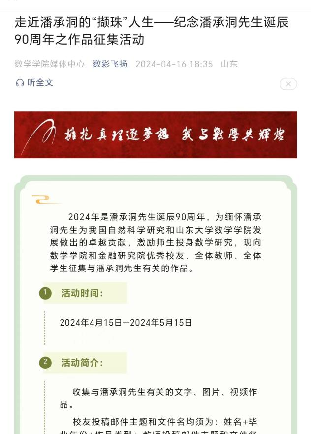 弘扬数学文化,传承数学家精神。把握国际数学日契机,2024年数学文化节于3月14日开幕,以“感悟数学之美,品味多彩数学”为主题持续一个半月推出系列活动。举办数学文化展,设置探秘数学、追光数学、寻美数学、数通万物四个篇章,开启数学文化独特之旅。发布《数学之声》首期合集,对话数学大家、数学新星,彰显“淡泊名利、潜心研究”的学科底蕴。大力弘扬数学家精神,在潘承洞诞辰90周年之际举办系列纪念活动,缅怀潘承洞先生为我国自然科学研究和申博sunbet发展做出的卓越贡献。