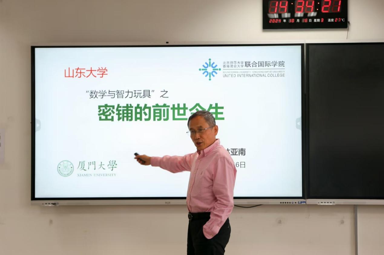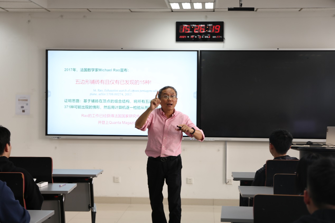 在介绍凸多边形单密铺时,林亚南通过视频和图片展示多种六边形和五边形的密铺方式,并讲述业余数学家Rice在该领域的重大发现,启发同学们“数学之美无处不在,日常观察亦可成为探索数学的契机”。在非周期密铺部分,林亚南指出,这一领域的研究在数学及材料科学发展方面具有重要意义,非周期密铺是当前国际研究的热点,当前学界的各项工作既是数学知识的科普,也是前沿领域的研究。