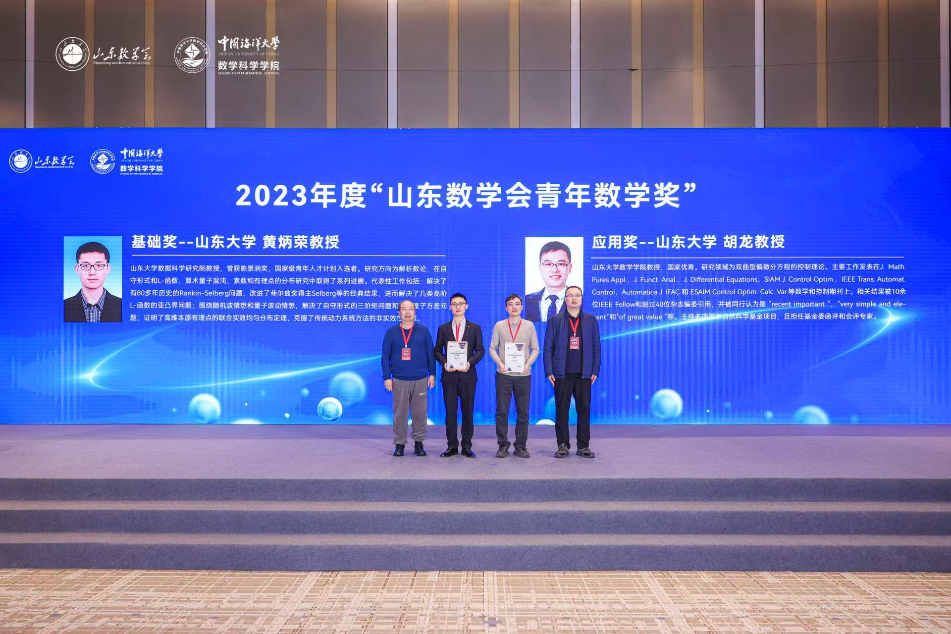 2025年1月4日,山东数学会2024年学术年会在山东青岛举行,会议上颁发了2023年度青年数学奖,共两人入选。申博sunbet黄炳荣教授、胡龙教授获2023年度山东数学会青年数学奖。