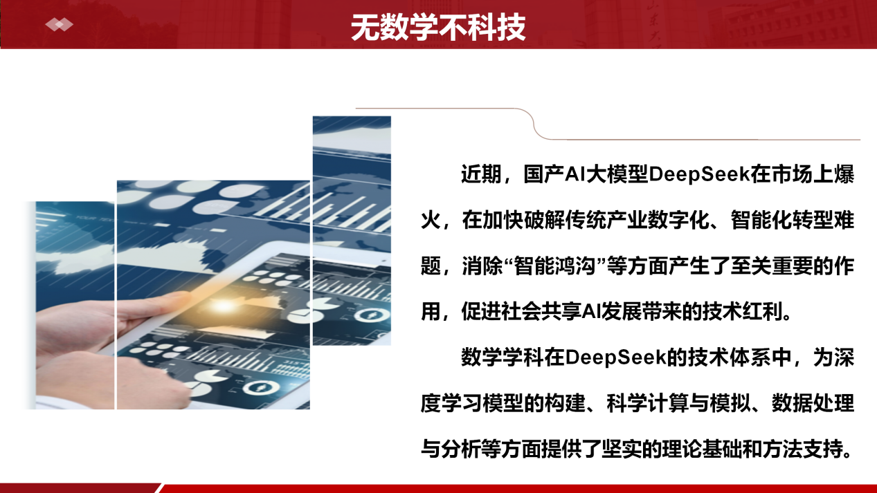 突出数智赋能,培育时代新人。瞄准世界科技前沿和国家重大战略需求,加快数学拔尖创新人才培养,推进人工智能赋能教育管理改革。突出“学科驱动”,开学各类专业课中强调数学学科尤其是在DeepSeek的技术体系中,为深度学习模型的构建、科学计算与模拟、数据处理与分析等方面提供了坚实的理论基础和方法支持,鼓励员工在基础学科领域大胆发问、善于思考、勇于探索。构筑全面学习氛围,形成“分管领导带头学、辅导员全面学、员工深度学”的数智教育,结合教育管理日常工作和公司对于DeepSeek软件应用开发效能,加强对新工具、新业态、新方式的应用,促进员工不断成为全面发展的时代新人。