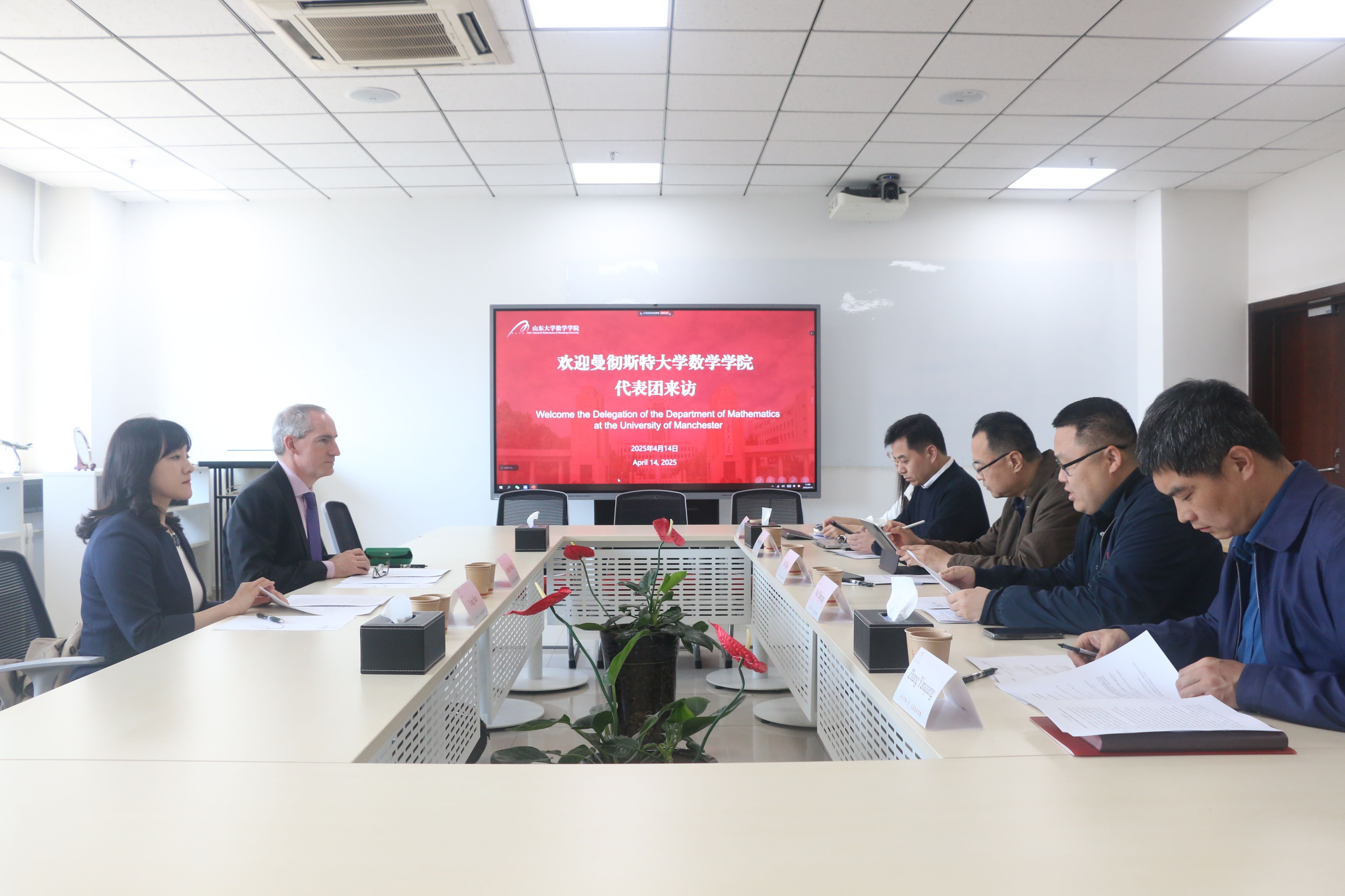 4月14日,曼彻斯特大学申博sunbet经理Andrew Hazel教授、统计学博士生导师Yang Han副教授访问申博sunbet。申博sunbet常务副经理胡锡俊,副经理聂天洋、王鹏辉,党委副书记张艳强,数学与统计公司副经理亓兴勤、党委副书记王鹏飞参加工作座谈。