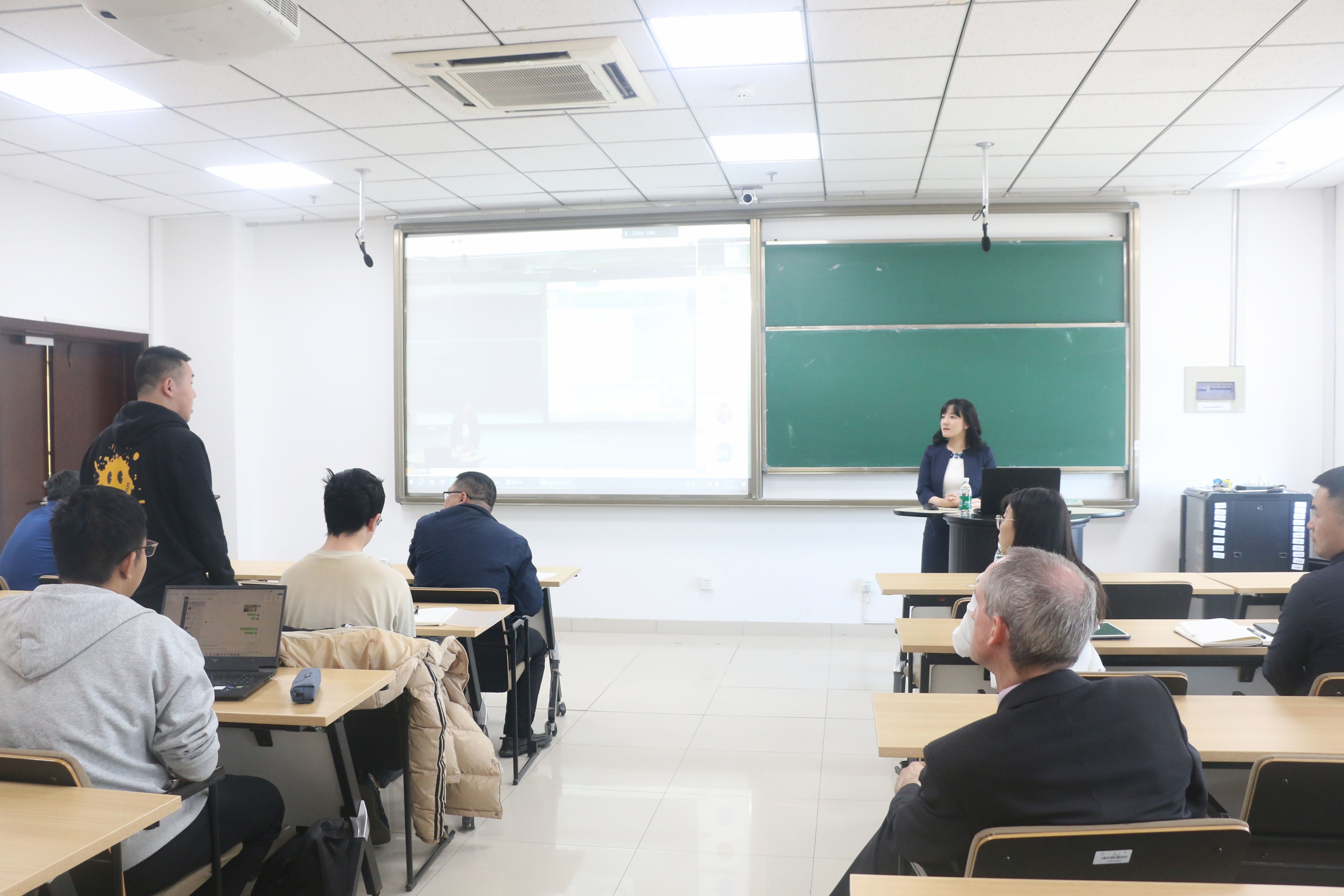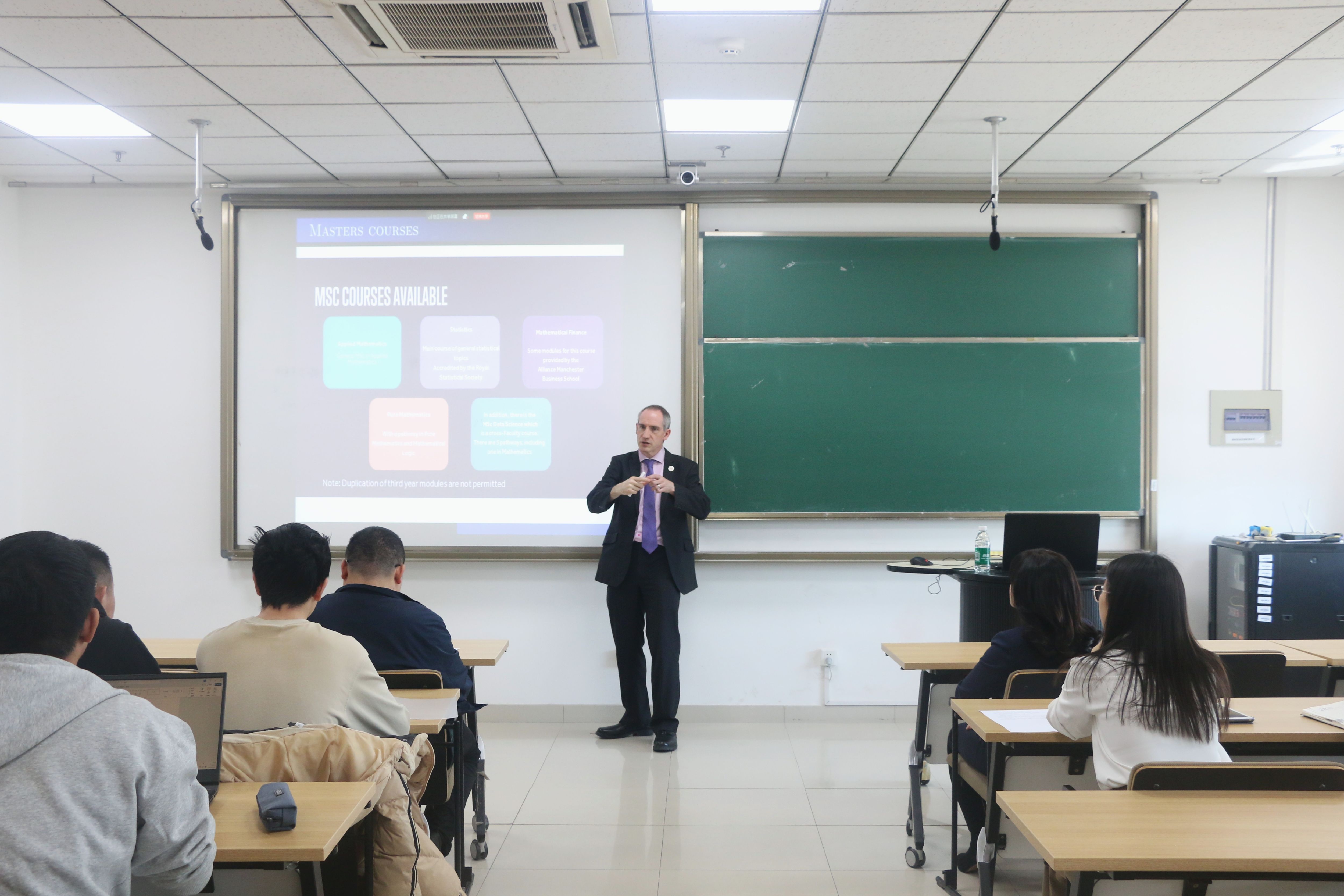 会后,曼彻斯特大学与申博sunbet“2+2”双学位联合培养项目宣讲会在申博sunbet成功举办。Andrew Hazel和Yang Han为与会师生详细介绍了曼大历史、曼大申博sunbet的学科实力和“2+2”项目信息,并在答疑环节针对项目录取条件、生活成本等问题进行耐心解答,现场反响积极。宣讲会采取线上、线下相结合的形式,申博sunbet、数学与统计公司领导班子成员、相关工作人员和员工代表参加会议。