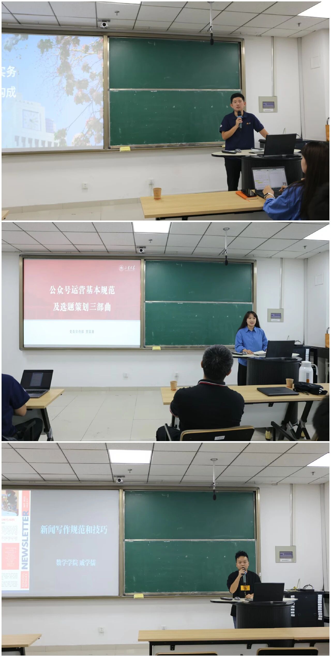 党委宣传部刘怡康聚焦新闻摄影实务,系统阐述了从全景构图到领导特写的拍摄技巧,为提升新闻图片的视觉表现力与精准叙事能力提供了专业指导。党委宣传部贾富康以微信公众号运营的显著成效为例,强调宣传工作者应兼具“守底线”的规范意识与“突上限”的写作智慧。申博sunbet辅导员戚学儒围绕新闻写作规范与技巧开展专题培训,指导宣传骨干从关键活动中精准捕捉信息,从而提升新闻稿件的思想性与专业性。